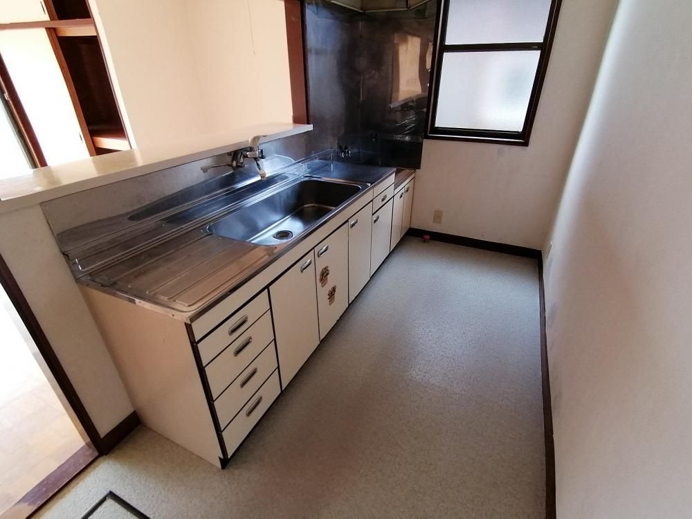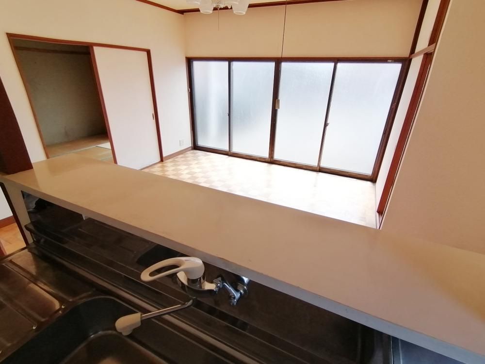 キッチンは対面式で食事の提供がしやすい!リビングのエアコンは1台、設備で付いています。